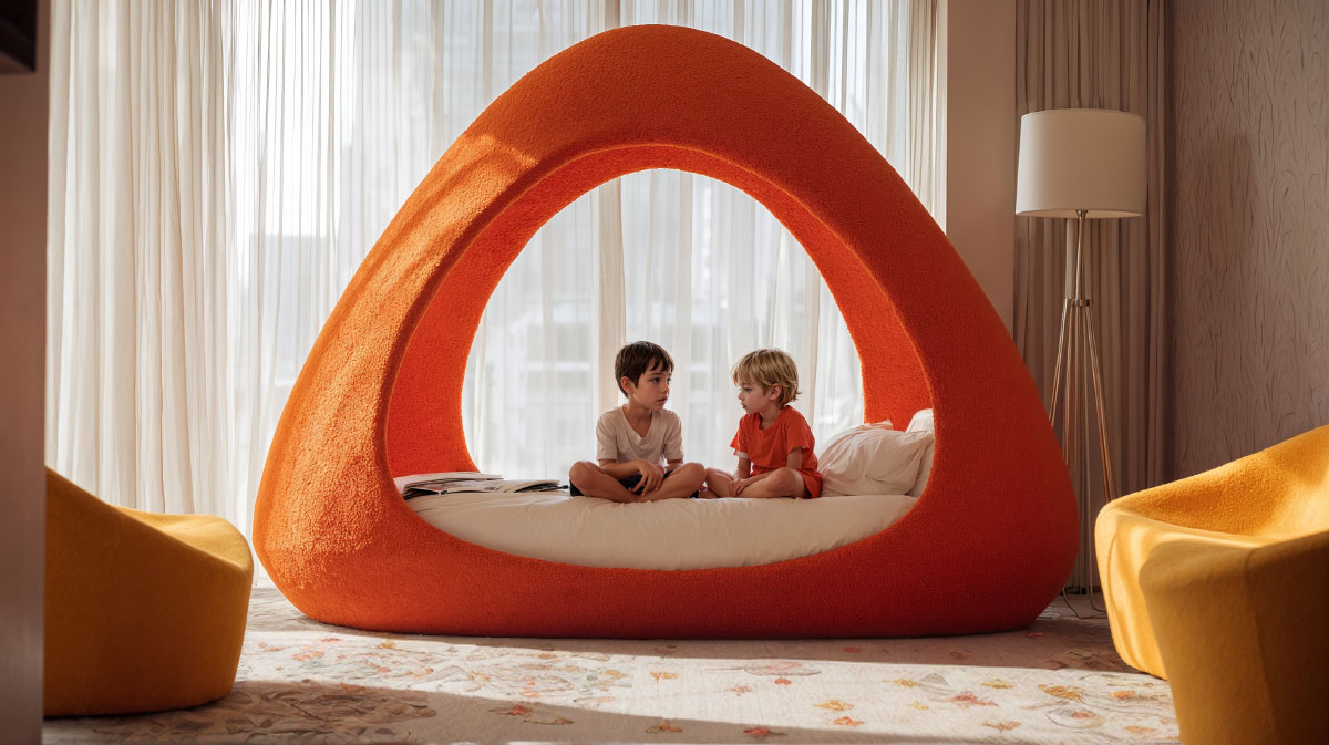 Le design privilégie des formes douces et des matériaux souples et rembourrés, agréables au toucher, capables de transmettre une sensation de calme et de confort. Ces micro-espaces amortissent les sons, favorisant ainsi la concentration et le recueillement. Parallèlement, leur matérialité presque sculpturale transforme la chambre en un véritable espace de jeu.