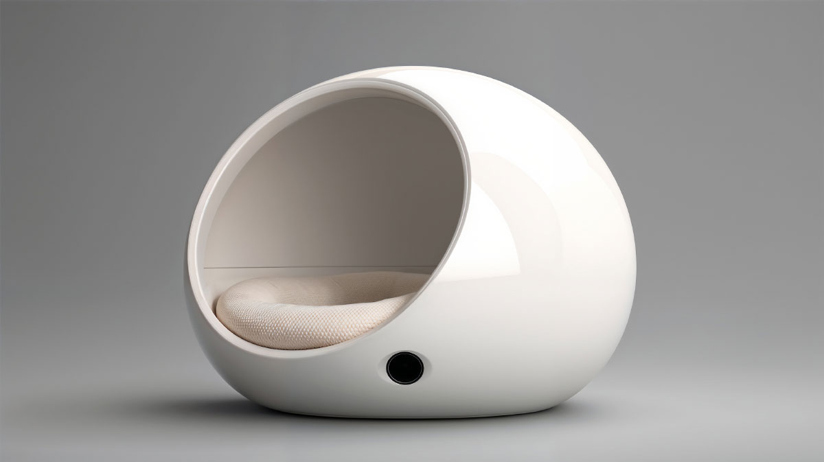 Fabriqué avec des matériaux haute densité, à finition satinée et agréable au toucher, doté d’une base rembourrée et d’une ventilation silencieuse, l’ensemble offre une sécurité sans isolement, un microhabitat idéal pour le repos. Sa forme sphérique enveloppe l’animal et favorise la relaxation ainsi qu’un sommeil profond. L’objet est facilement démontable pour le nettoyage.
