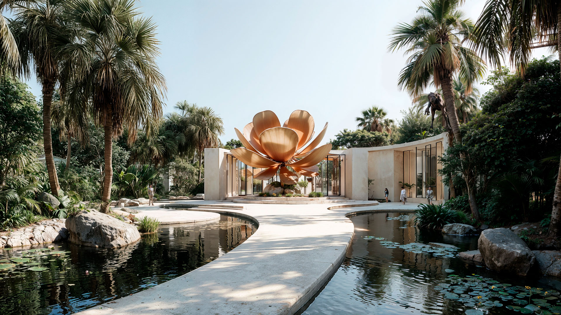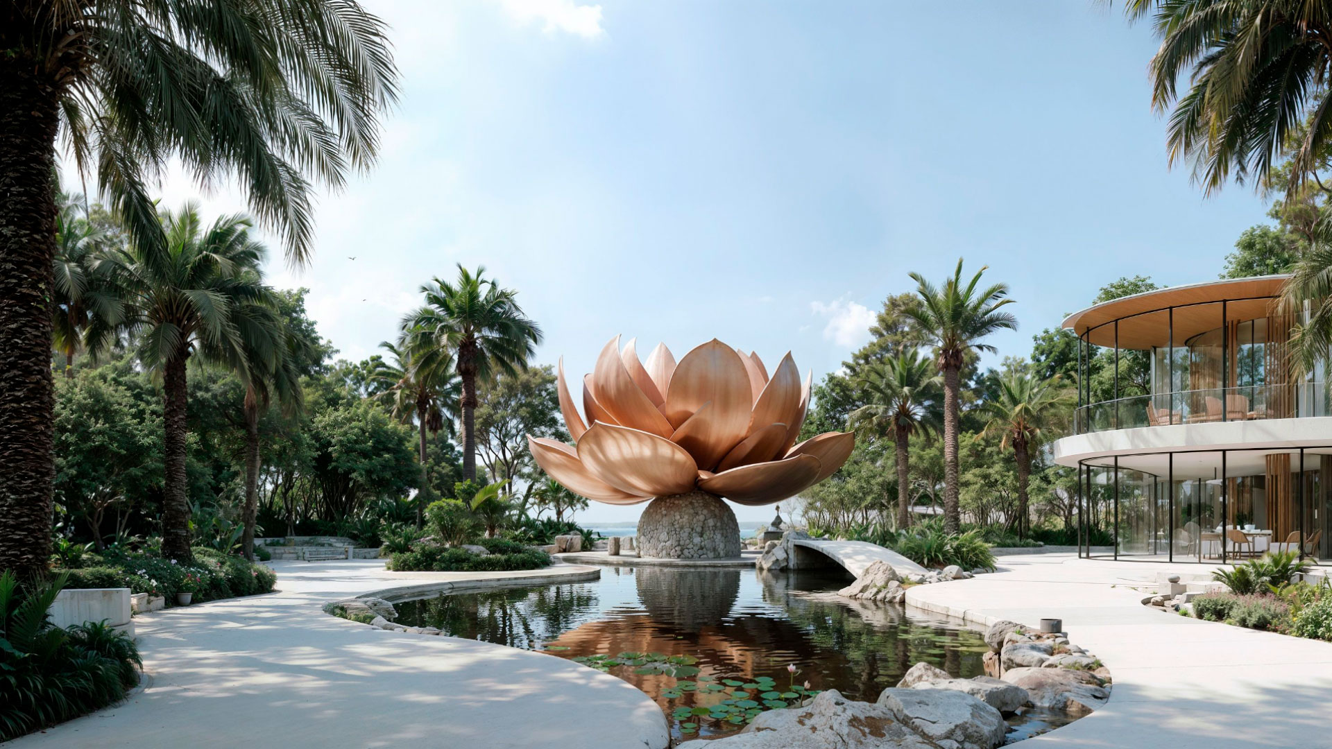 Dans ce nouveau projet, la proposition du Département de Design d’Amusement Logic met en avant un repère sculptural sous la forme d’une fleur monumentale. L’idée du concept de design est de faire de cette fleur un emblème identitaire au sein d’un hôtel resort. Sa présence transforme l’espace en une référence spatiale. Par ailleurs, comme vous pouvez le constater, le projet intègre nature, art et architecture avec un langage contemporain et évocateur.