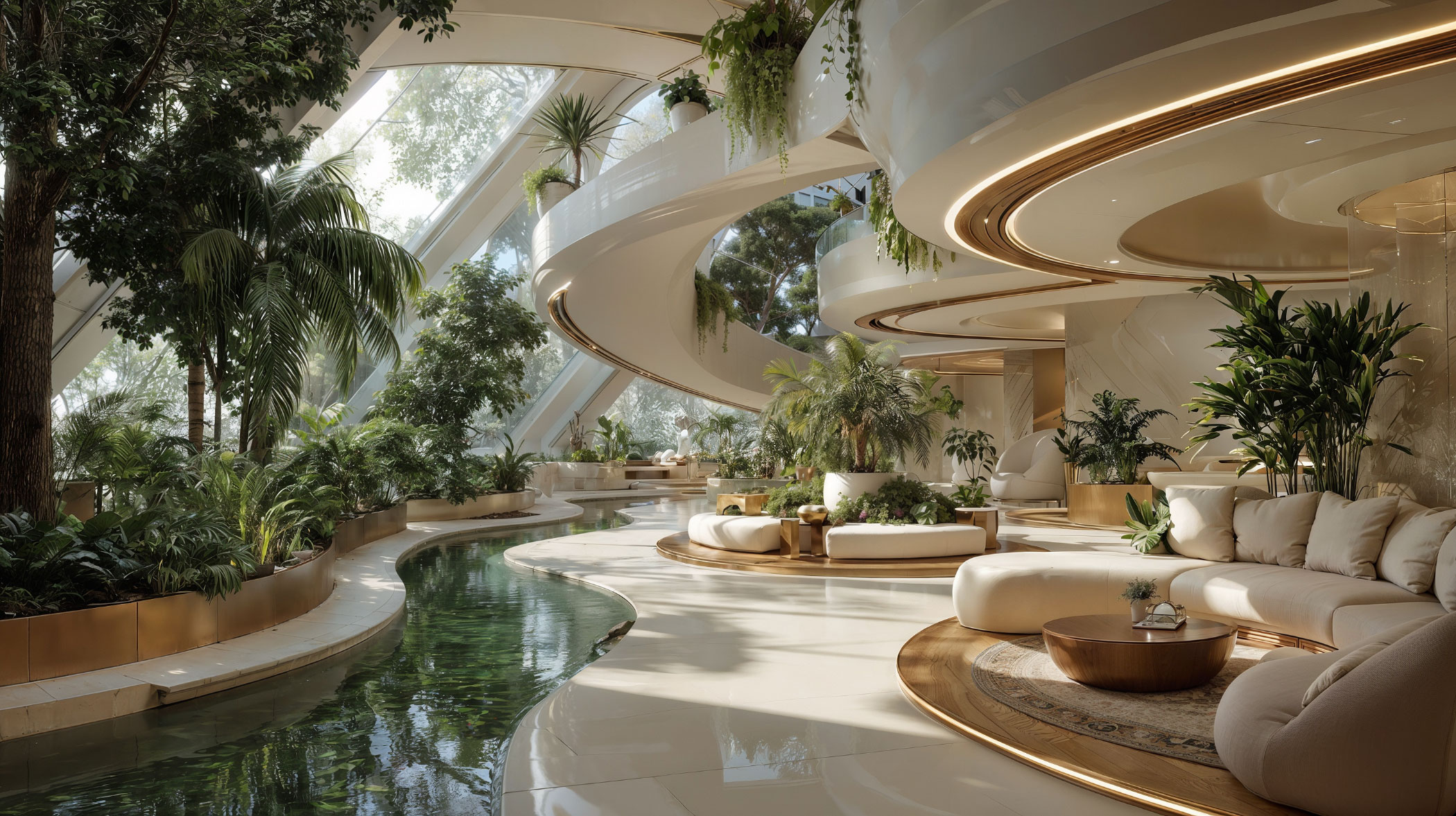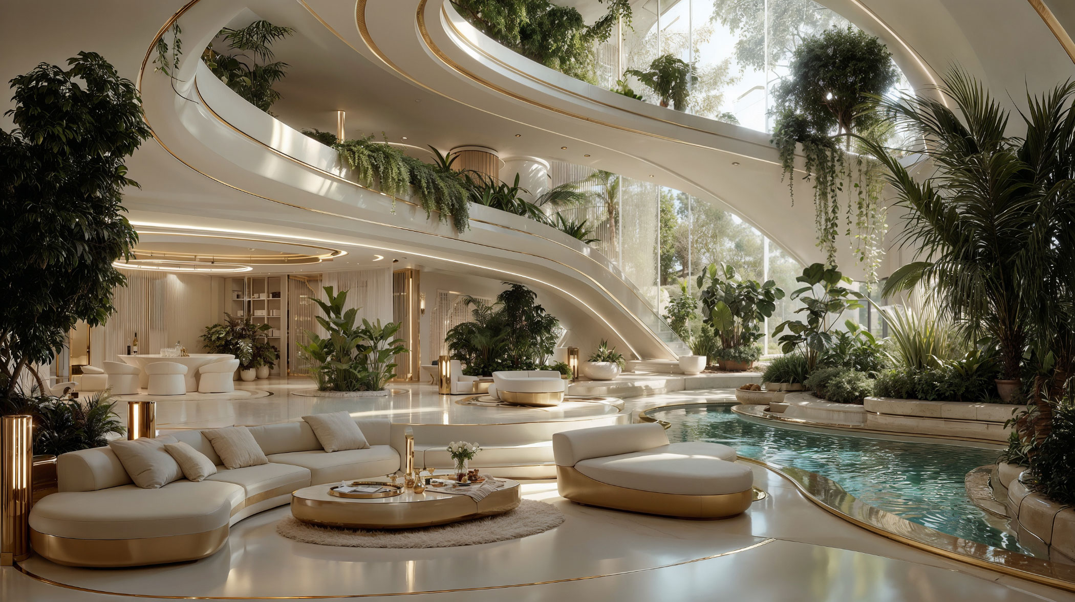 Des surfaces blanches polies et de subtils détails dorés créent une atmosphère de calme majestueux. L’eau et la végétation sont intégrées de manière stratégique afin d’amplifier la sensation de fraîcheur, de sérénité et de bien-être. La lumière naturelle se reflète sur des matériaux de très haute qualité et des finitions de grande artisanerie. Le tout vise à transmettre statut, équilibre et sophistication.
