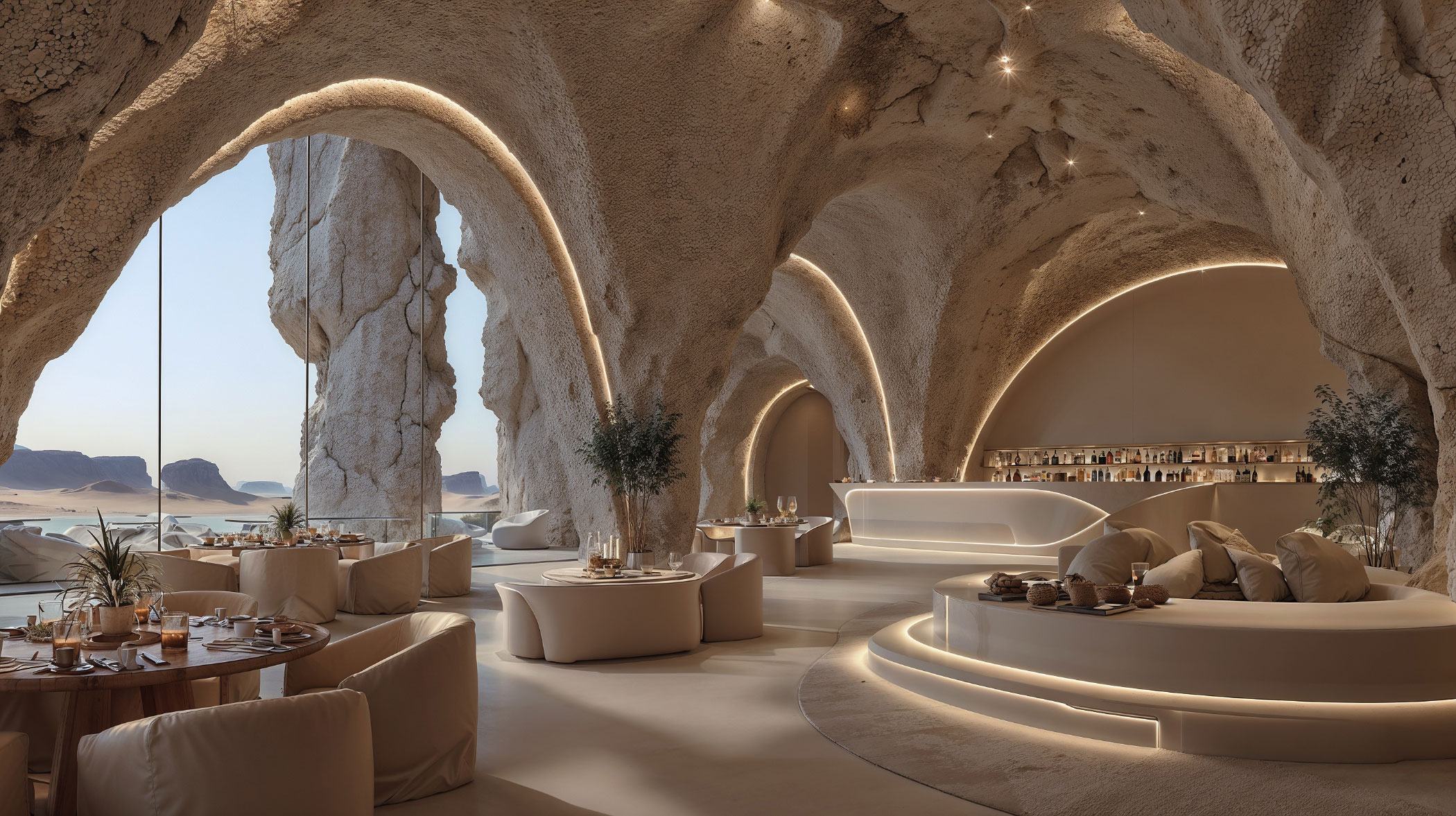 Avec ce projet, le Département de Design d’Amusement Logic explore le concept de luxe naturel à travers une architecture qui fait de la roche sa matière première. Des textures minérales, des lumières chaudes et des courbes douces créent, dans les espaces sculptés dans la pierre, une atmosphère intime et sophistiquée.