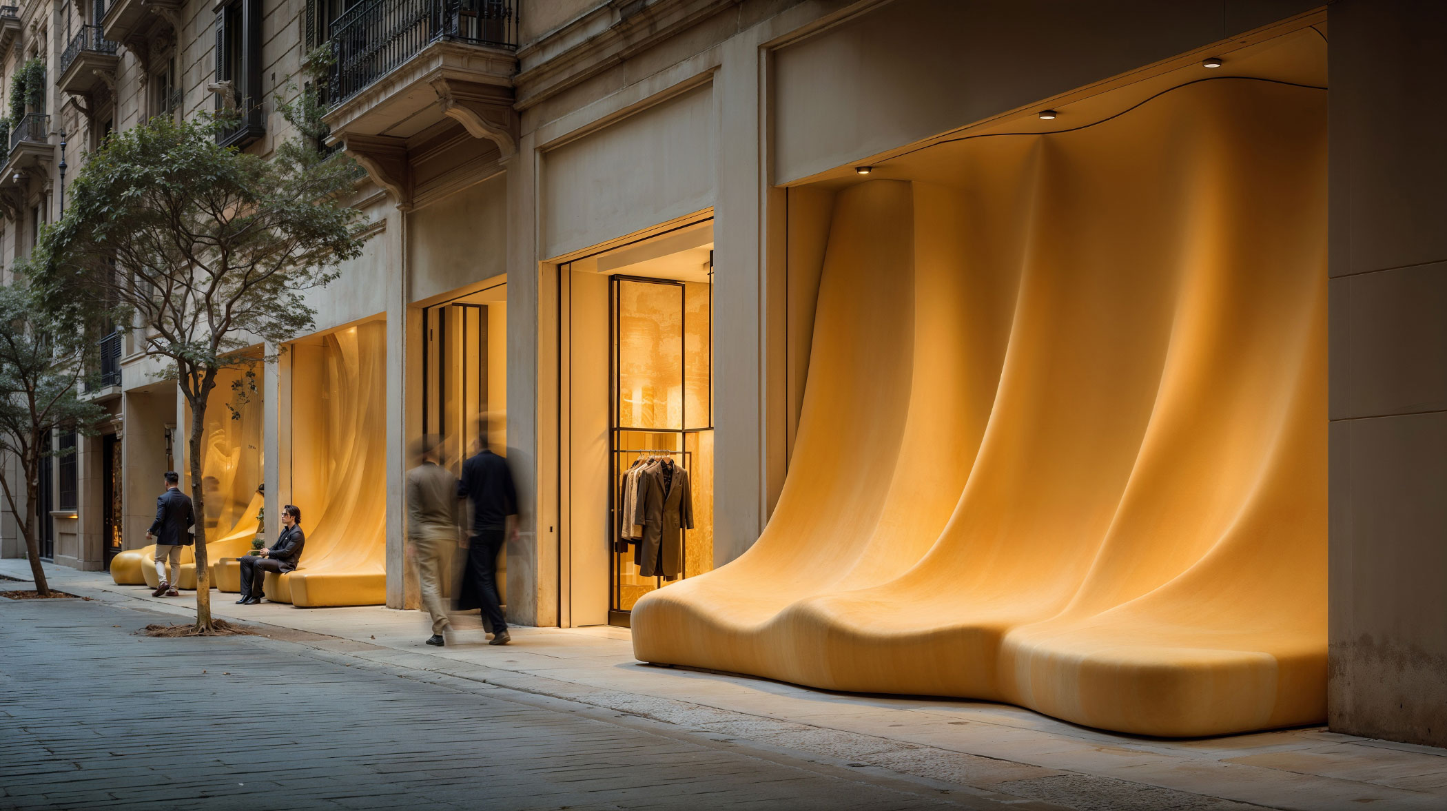 Au-delà du concept traditionnel de vitrine, avec cette nouvelle proposition du Département de Design de Amusement Logic, la façade se transforme en un élément sculptural. Elle capte le regard tandis que les plis organiques de sa surface génèrent des recoins et des assises. Ainsi, l’expérience d’achat devient le prolongement naturel de la promenade dans l’espace public.