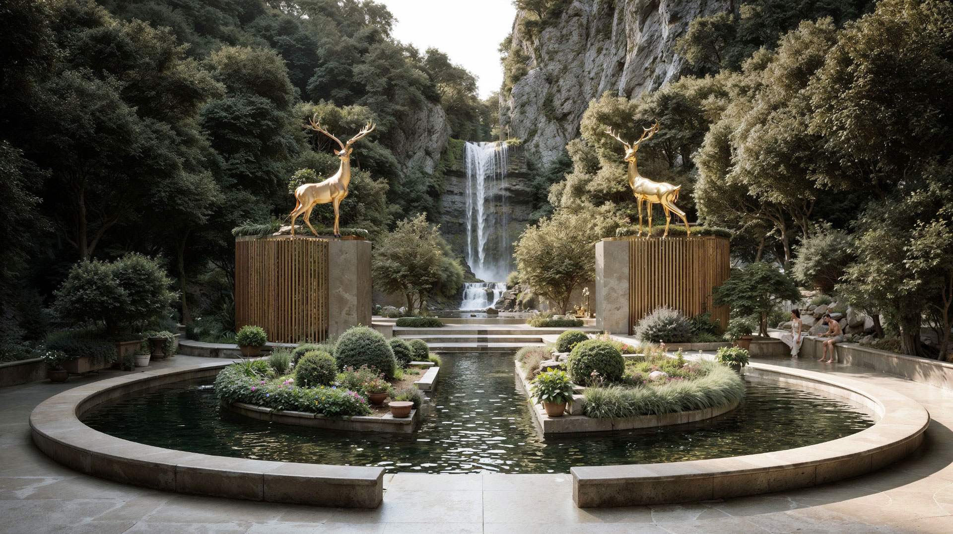 Nous vous présentons cette fois une série de patios centraux dans des hôtels et resorts, centres commerciaux ou villas privées de luxe, proposés par l’équipe de design d’Amusement Logic. Une expérience spatiale d’exclusivité et de sophistication. Les sculptures dorées, à la fois monumentales et symboliques, confèrent à l’atmosphère un aspect de majestuosité, de force, d’élégance.