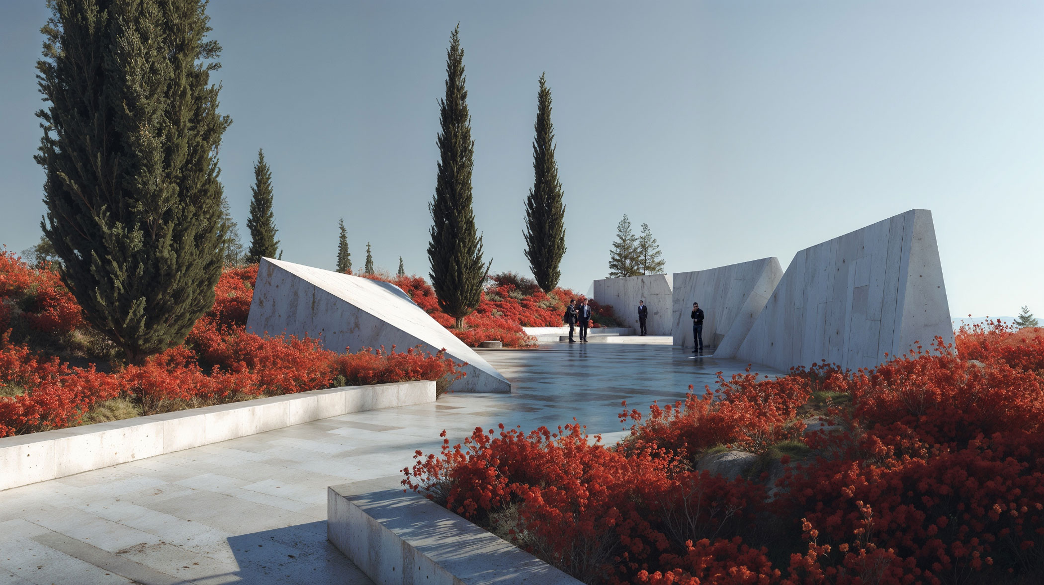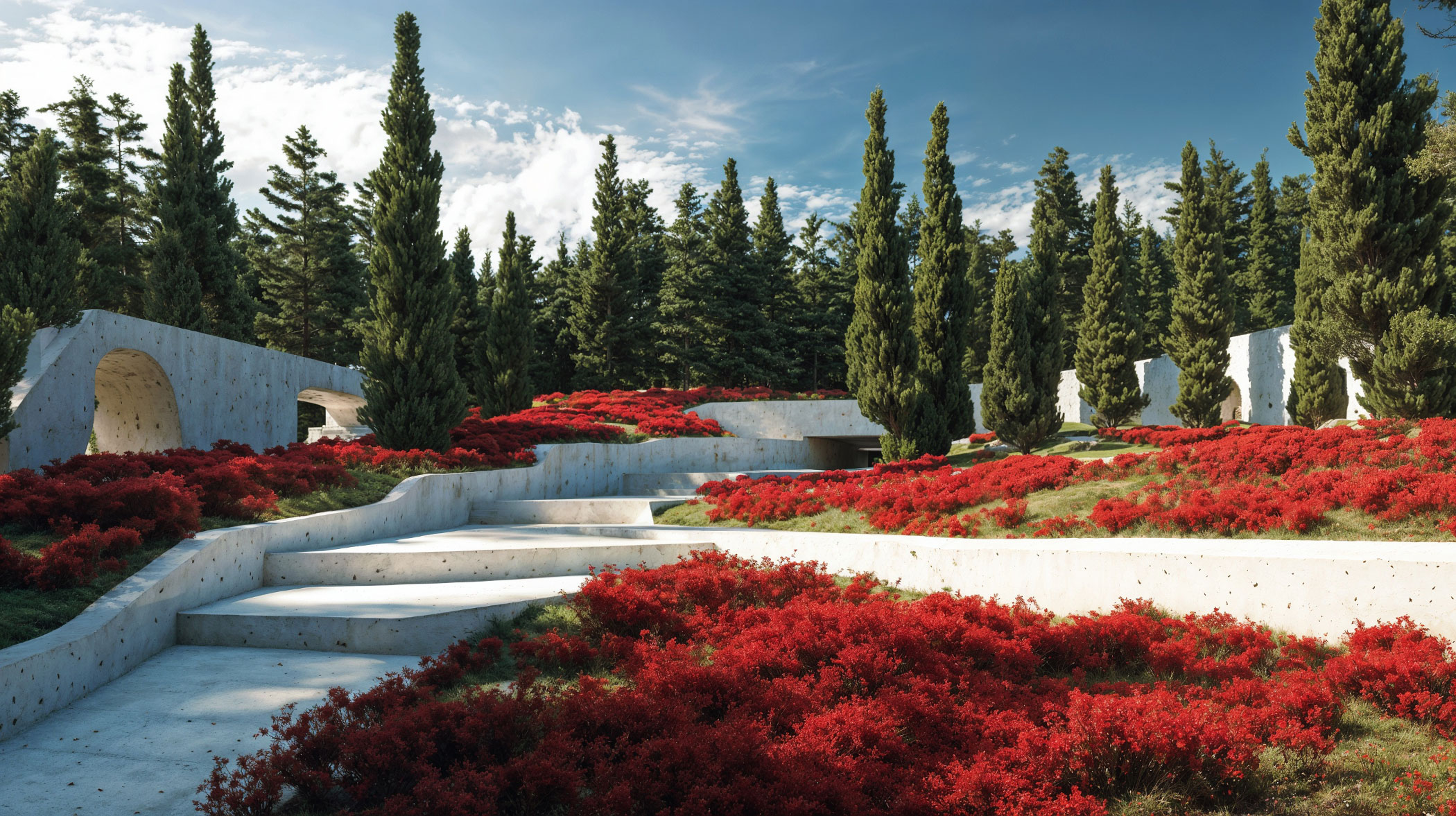 La présence de cyprès et de tapis floraux renforce la verticalité et le rythme visuel de l’ensemble, en une évocation des jardins cérémoniels classiques de l’aire méditerranéenne. Les masses de fleurs rouges produisent un contraste marqué avec les murs clairs, dans une composition chargée de dramatisme et de vitalité. L’équilibre entre rigueur géométrique et exubérance naturelle définit un paysagisme intemporel.