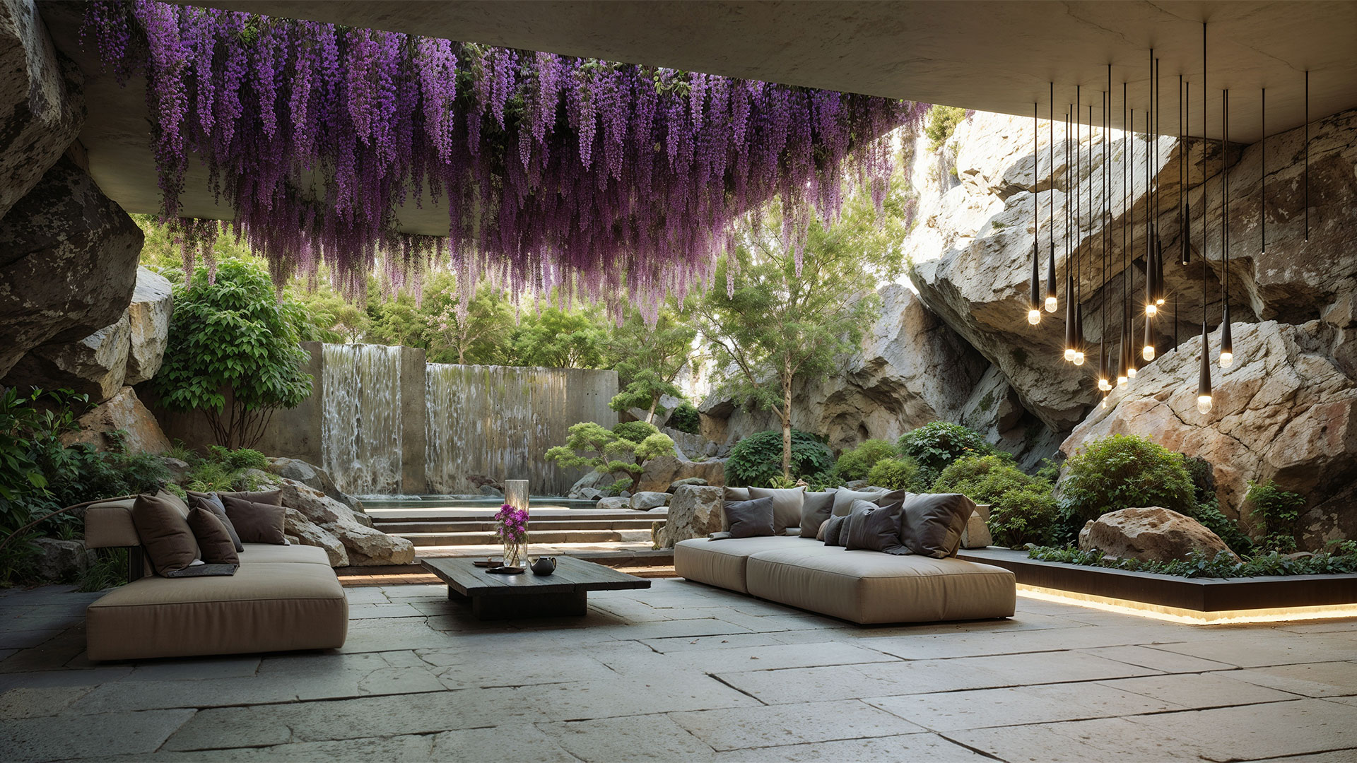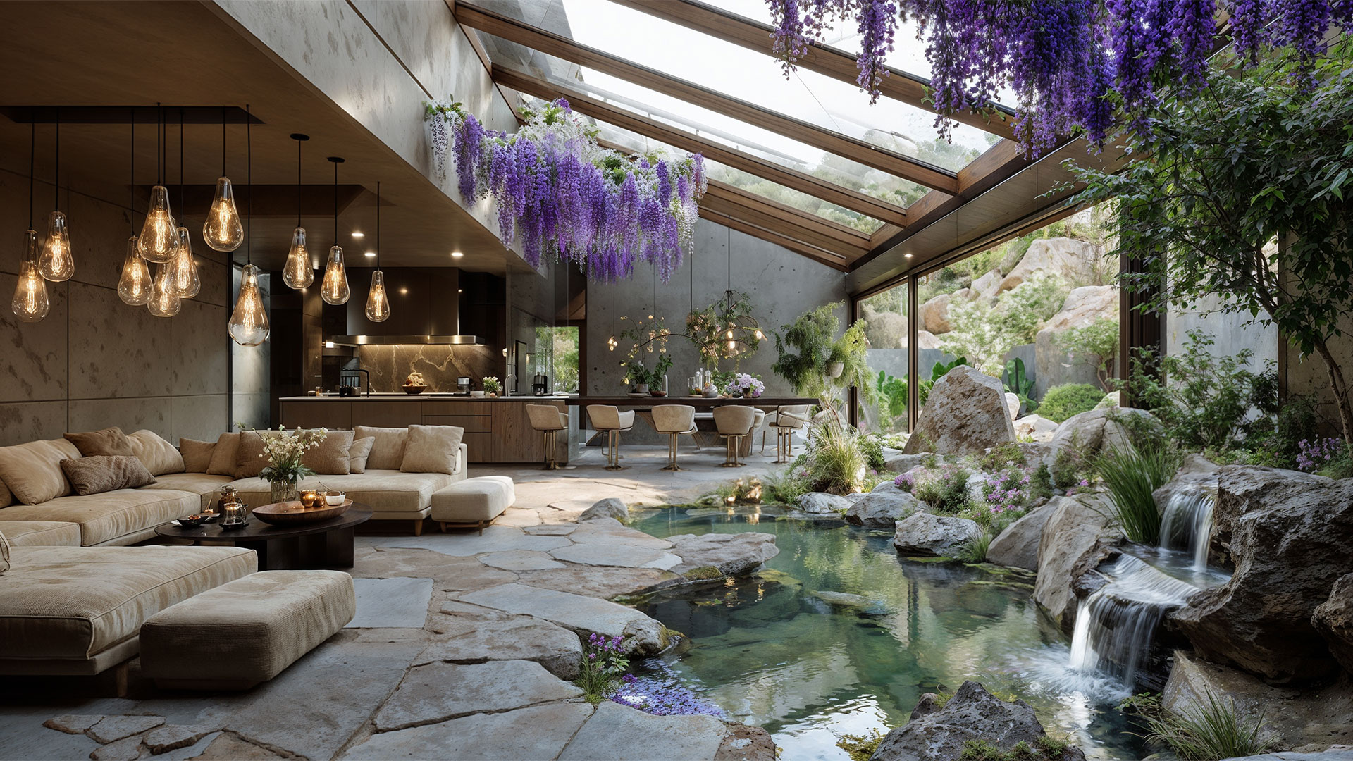 Le Département de Design d’Amusement Logic propose un salon-jardin couvert. La nature entre dans la maison comme une invitée permanente. Une végétation abondante, des miroirs d’eau et de douces cascades cohabitent avec la pierre noble et le bois chaleureux, tandis que la lumière filtrée descend des lanternaux, ravive les textures et éveille les reflets. Le résultat est une atmosphère écologique immersive qui invite au repos, à la conversation paisible ou au travail, sans pour autant renoncer au confort intérieur.