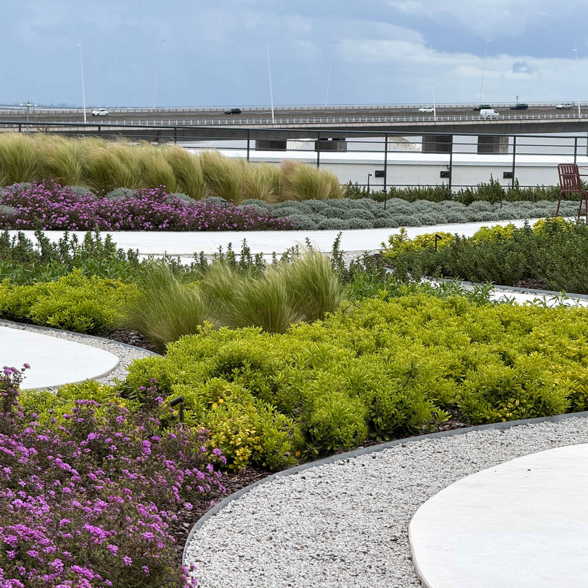 Puis est venu le tour de LJ-Group : les paysagistes ont aménagé sur 3,7 ha une série de allées, massifs, jardins, passages, zones de repos et espaces événementiels offrant des vues panoramiques sur la capitale. «La terrasse combine végétation native et adaptative avec des chemins organiques», créant ainsi un environnement qui «favorise à la fois le mouvement et la pause». La rigoureuse géométrie du bâtiment est ainsi adoucie par l’organicité du paysage conçu par LJ-Group.