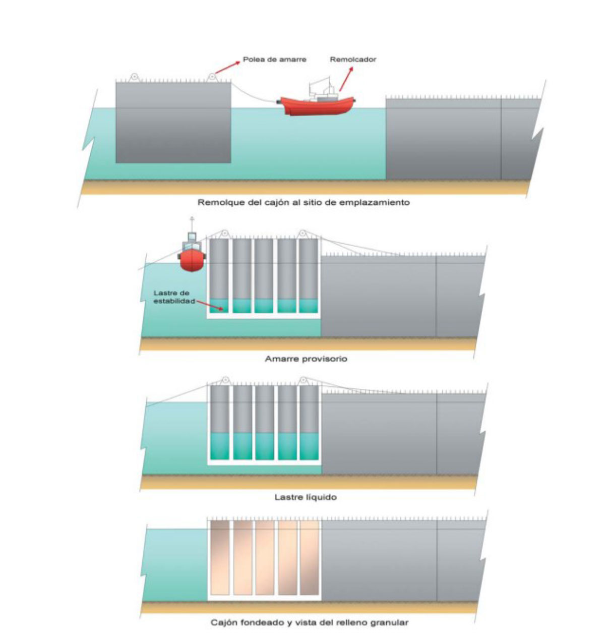 L’une des techniques permettant de réaliser des fondations sous l’eau repose sur l’utilisation de structures flottantes. Il s’agit essentiellement de construire des éléments creux en béton armé qui, grâce à leur caractère creux, sont transportés par flottaison jusqu’à leur emplacement définitif, où ils sont ensuite immergés de manière contrôlée. Dans la majorité des cas, la construction de ces structures flottantes est réalisée dans des zones inondables adjacentes au littoral. Cette méthode permet d’éviter la manipulation d’éléments de dimensions et de poids considérables, presque impossibles à lever et à déplacer à l’aide de grues.