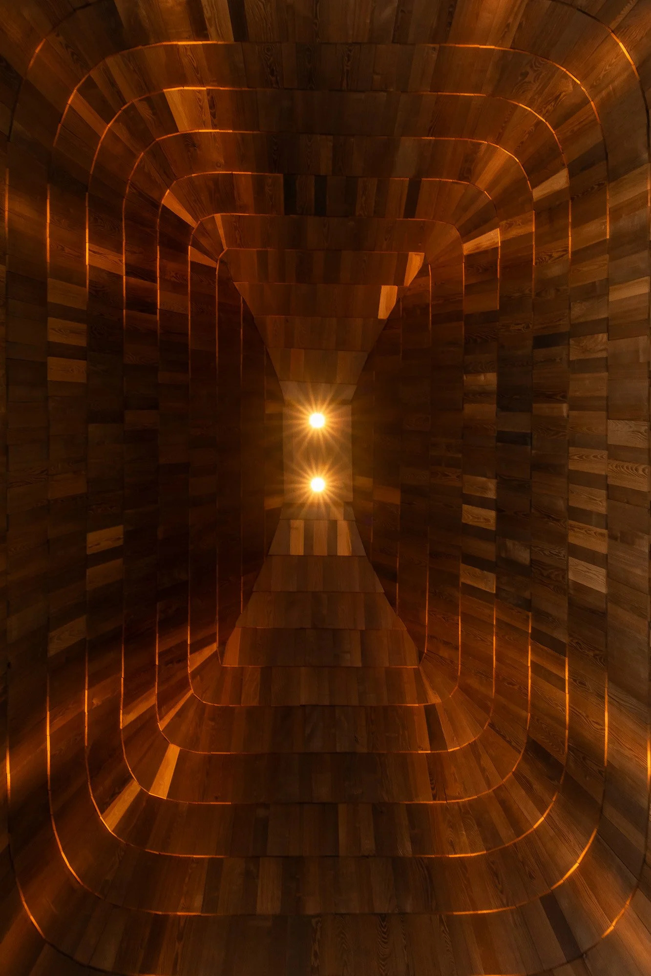 Le résultat est une architecture minimaliste en plan, mais riche en section. Au rez-de-chaussée, un noyau fonctionnel en béton — avec la salle de bain comme élément central — structure l’espace. Deux ailes s’en déploient : l’une pour la chambre, l’autre pour le séjour principal. Mais c’est le toit qui définit véritablement le projet : il enveloppe, protège et donne son identité à l’ensemble. Revêtu intérieurement de lamelles de bois, il évoque les textures traditionnelles tout en offrant une hauteur spectaculaire de 10 mètres, créant une sensation d’amplitude inattendue dans un espace de seulement 50 m².