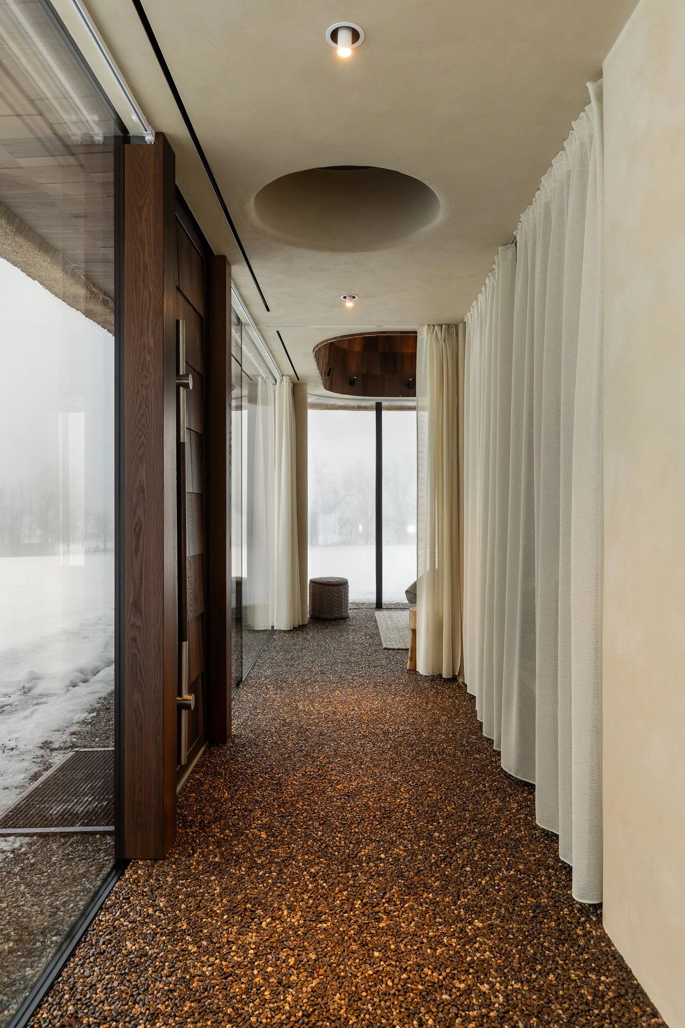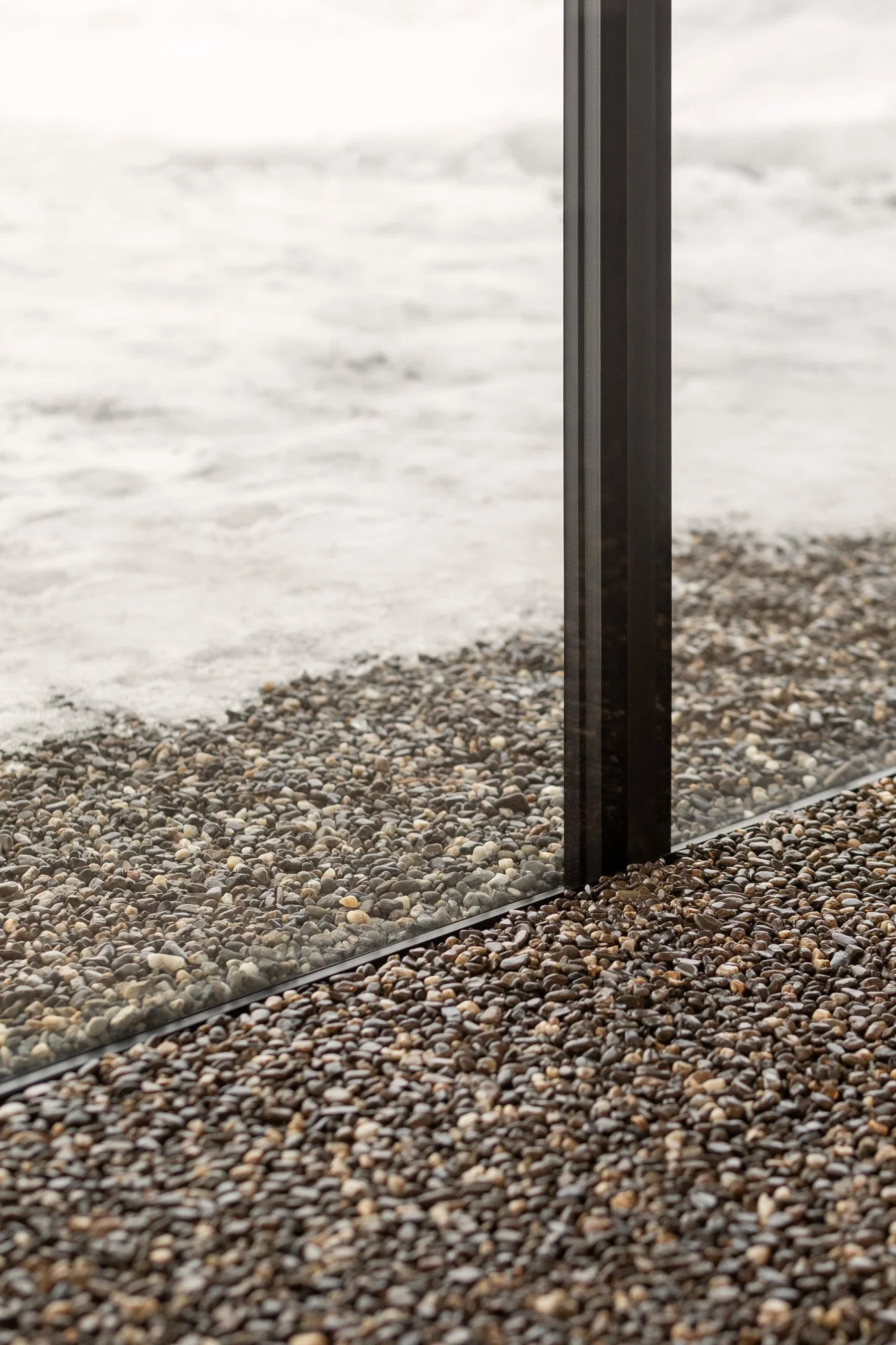 De jour, la toiture semble flotter au-dessus du paysage, posée sur des façades vitrées presque invisibles. Le sol, traité avec un revêtement continu minéral, identique à l’intérieur et à l’extérieur, renforce la continuité spatiale. Pour préserver l’intimité, des rideaux automatiques peuvent transformer instantanément l’espace.