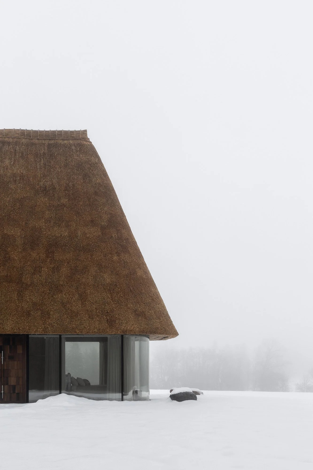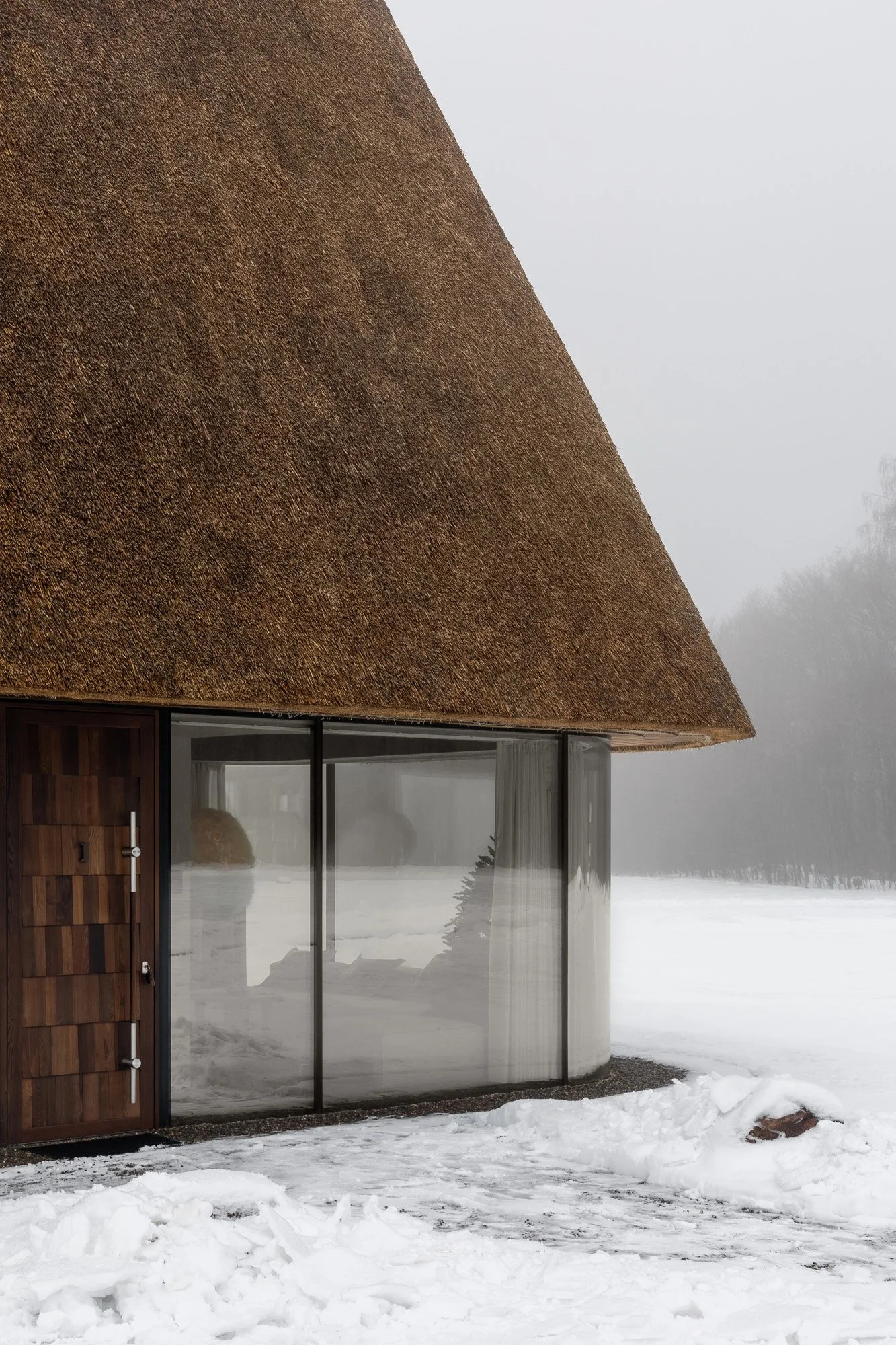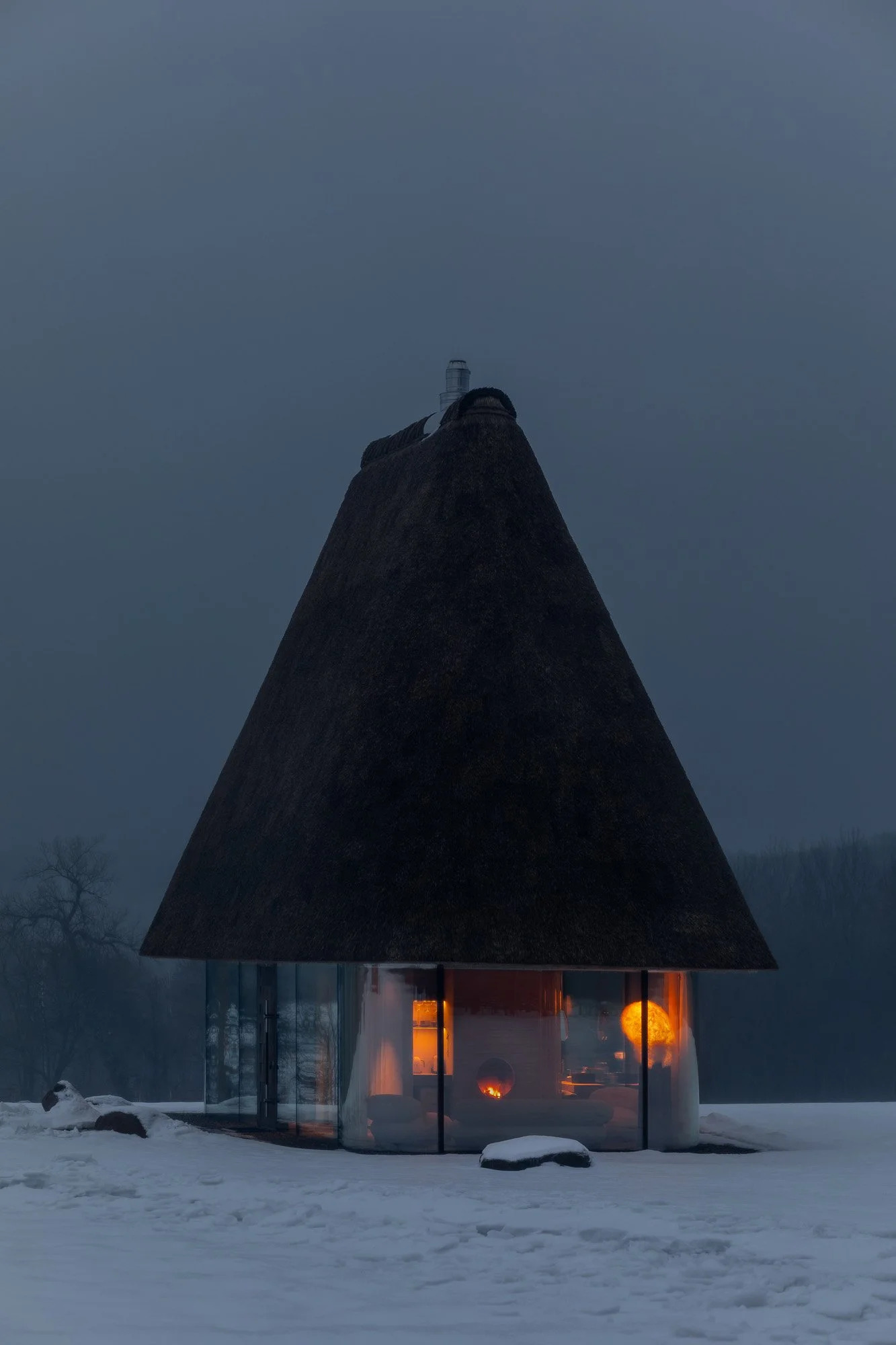 L’inspiration provient de l’architecture populaire ukrainienne, et plus précisément de la maison rurale mazanka. Le projet en reprend des éléments essentiels — murs blanchis à la chaux, toiture végétale, organisation spatiale — mais les réinterprète avec un langage contemporain. Les murs massifs traditionnels deviennent ici de vastes surfaces vitrées, ouvertes sur la lumière et le paysage. Quant à la toiture en chaume, elle se transforme en un geste architectural dominant, véritable signature du projet.