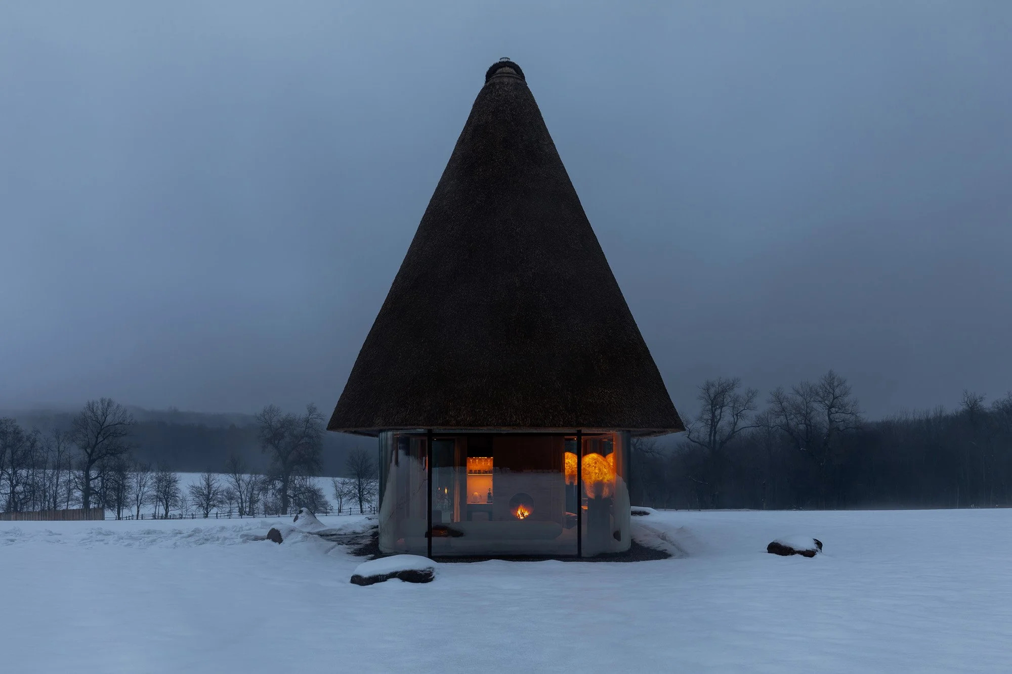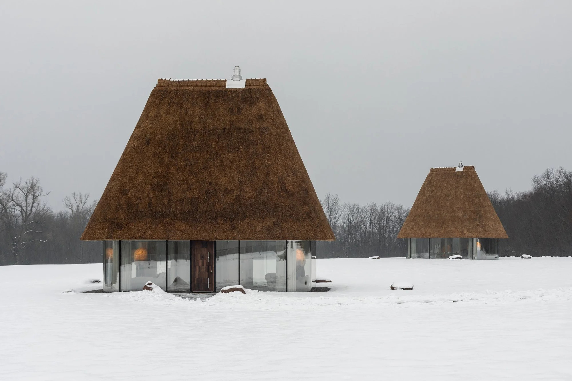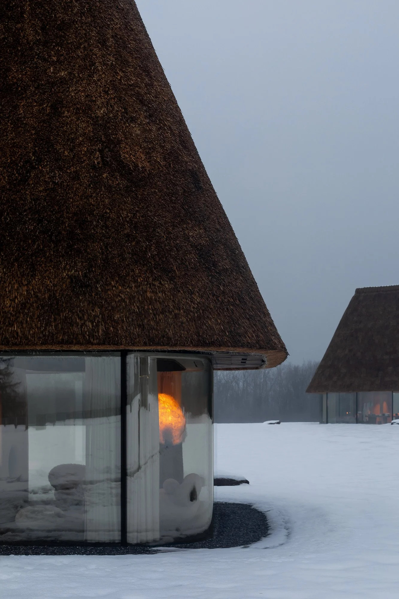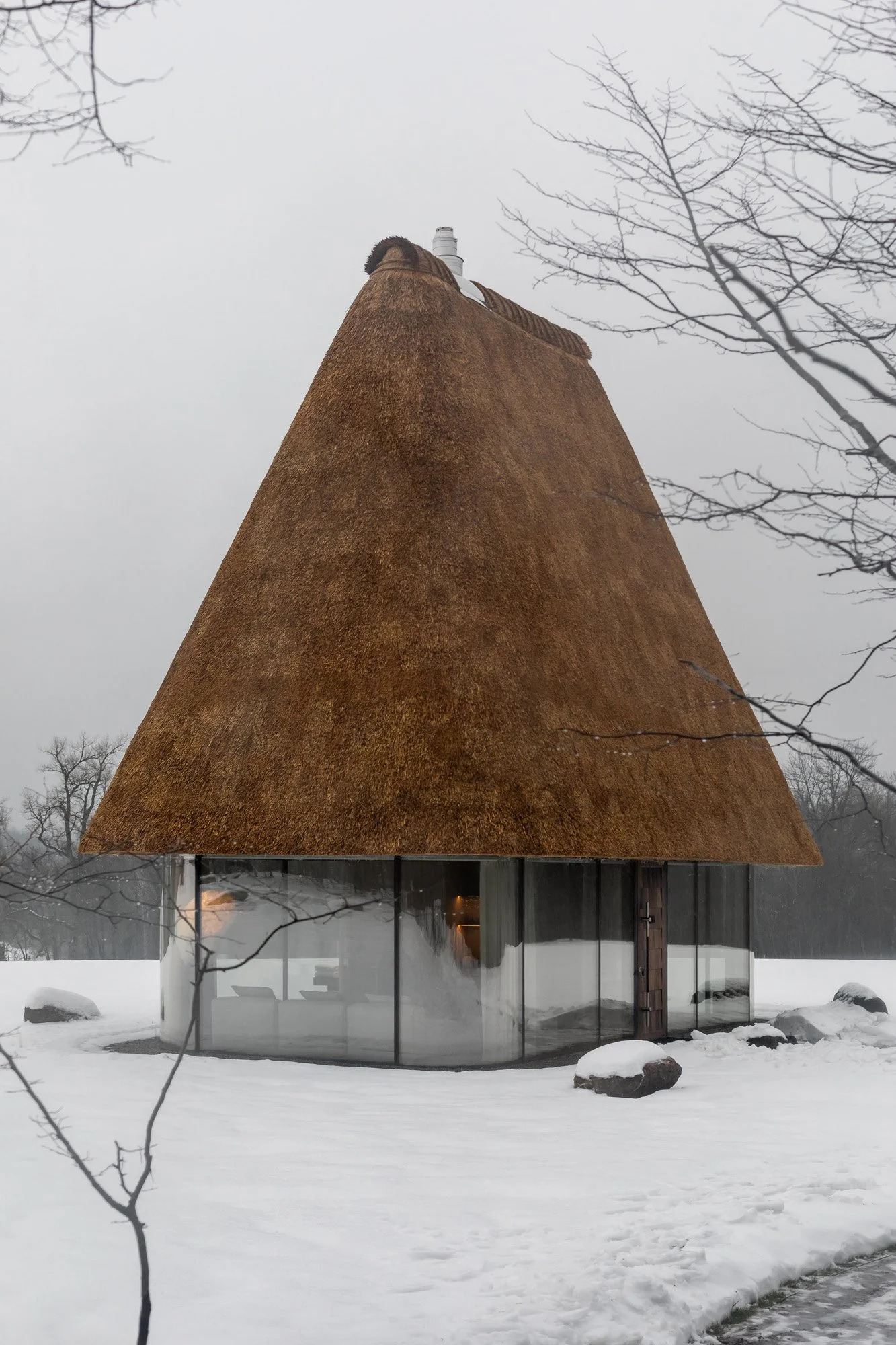 L’inspiration provient de l’architecture populaire ukrainienne, et plus précisément de la maison rurale mazanka. Le projet en reprend des éléments essentiels — murs blanchis à la chaux, toiture végétale, organisation spatiale — mais les réinterprète avec un langage contemporain. Les murs massifs traditionnels deviennent ici de vastes surfaces vitrées, ouvertes sur la lumière et le paysage. Quant à la toiture en chaume, elle se transforme en un geste architectural dominant, véritable signature du projet.
