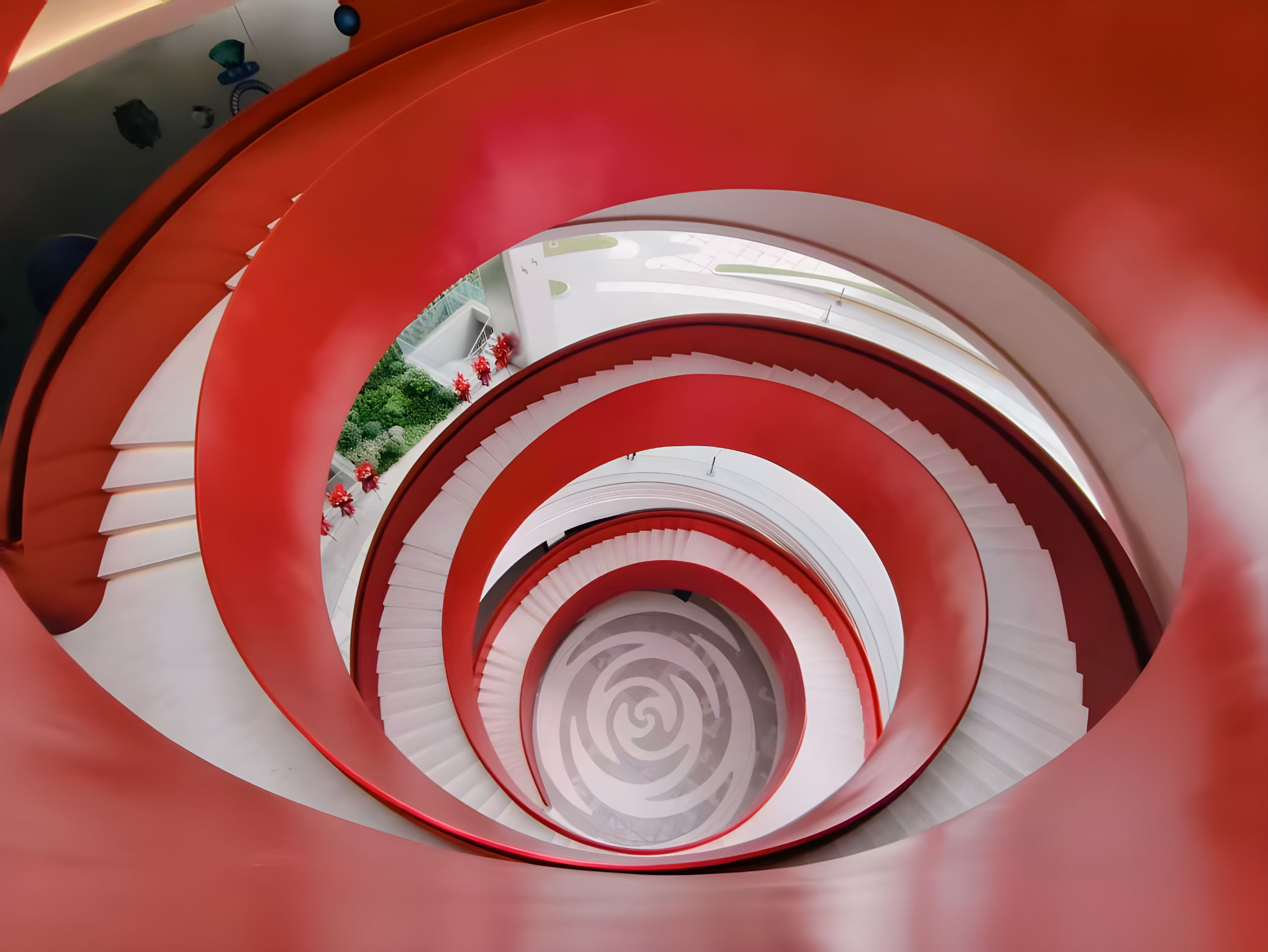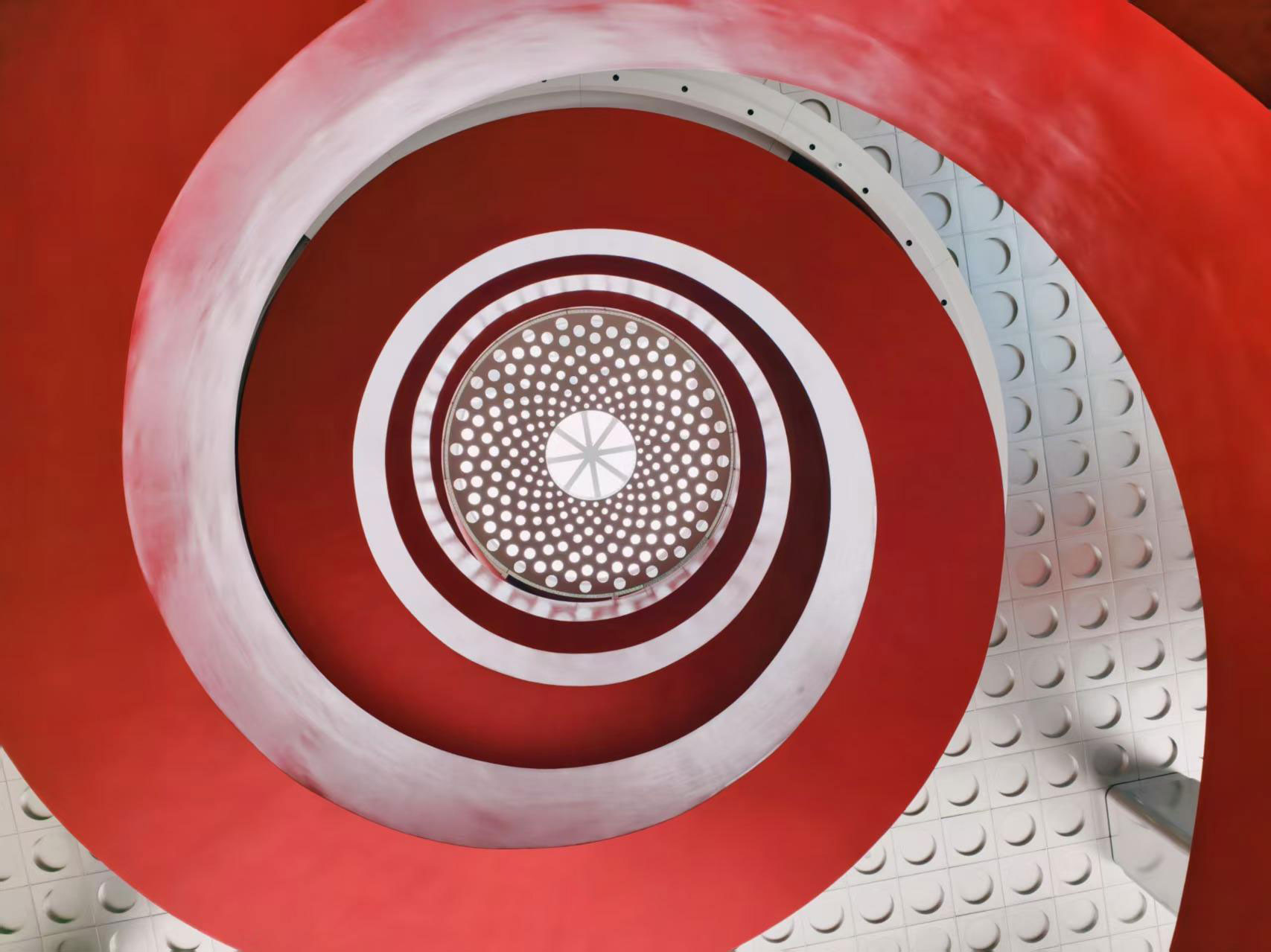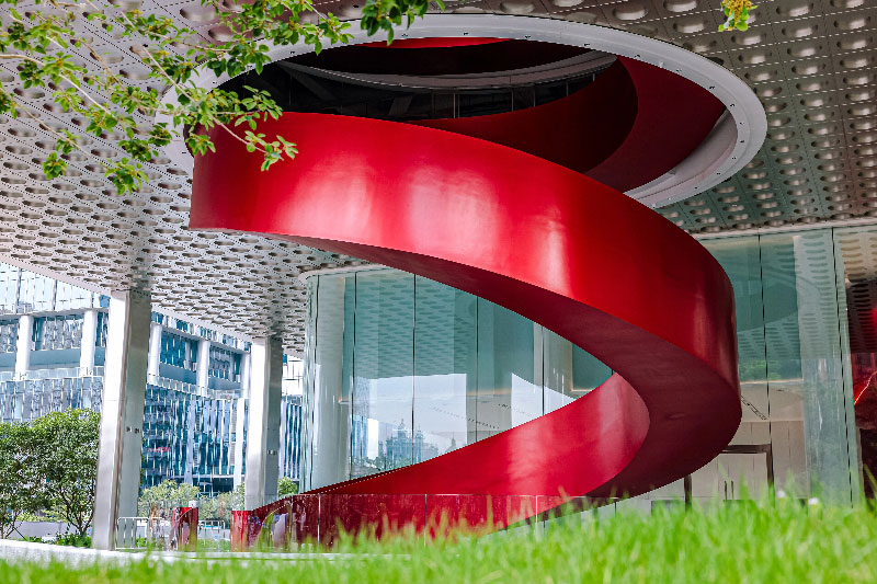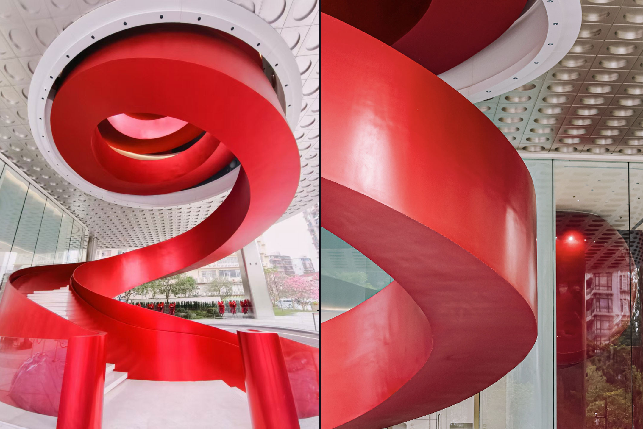 Les chiffres parlent d’eux-mêmes : d’un écarlate éclatant, la Ribbon of Pearl River atteint une hauteur totale de 31,342 m et se déploie sur une spirale de 186,315 m d’acier, avec un diamètre de 13,6 m. Ce qui en fait un monument singulier n’est cependant pas tant sa taille que l’un de ses détails constructifs : elle comprend une section continue de 11,995 m sans aucun support central ni pilier, ce qui lui a valu, en décembre 2025, une reconnaissance officielle du Guinness World Records comme « plus grande hauteur de section d’escalier hélicoïdal sans support au monde ».