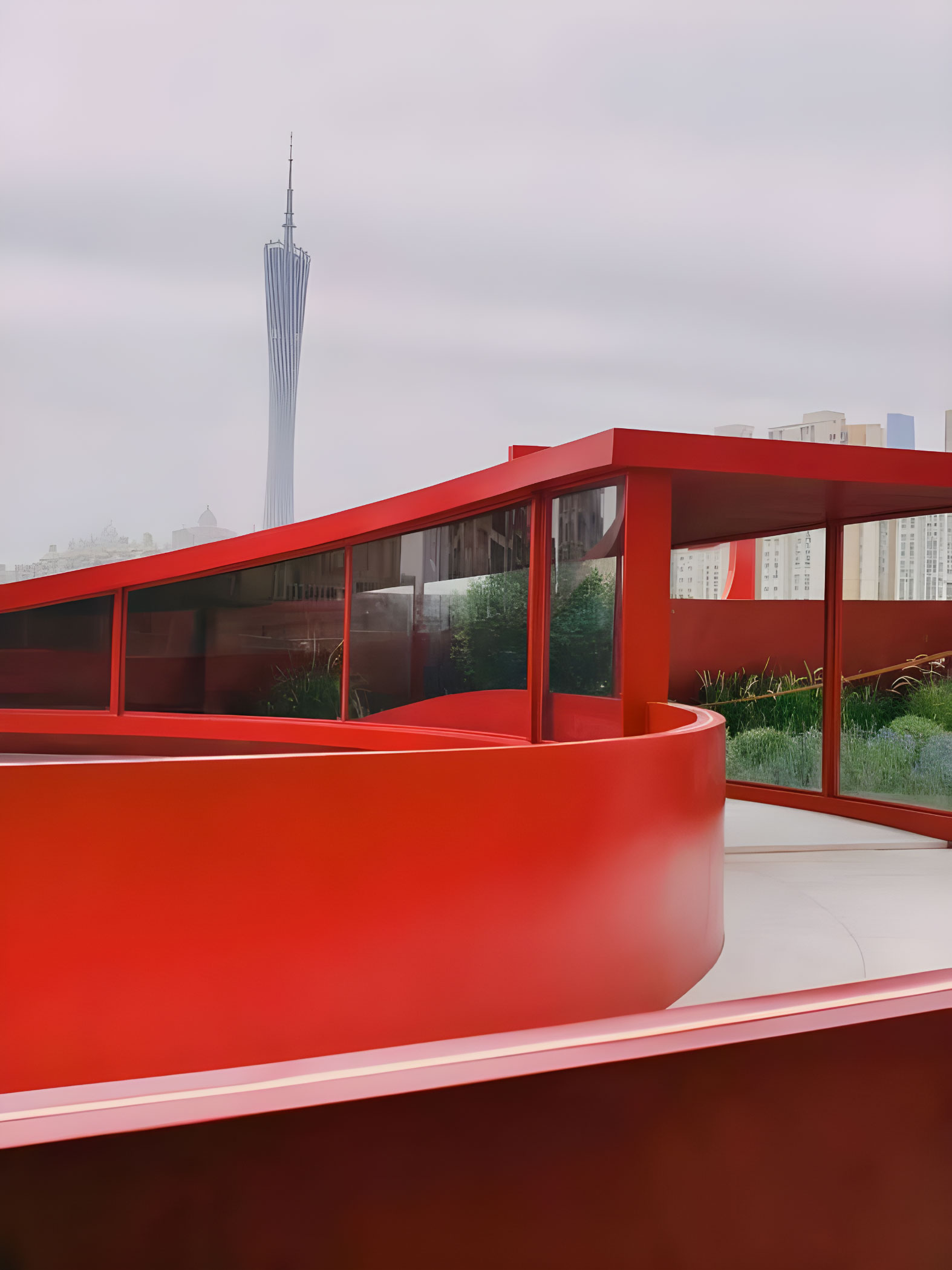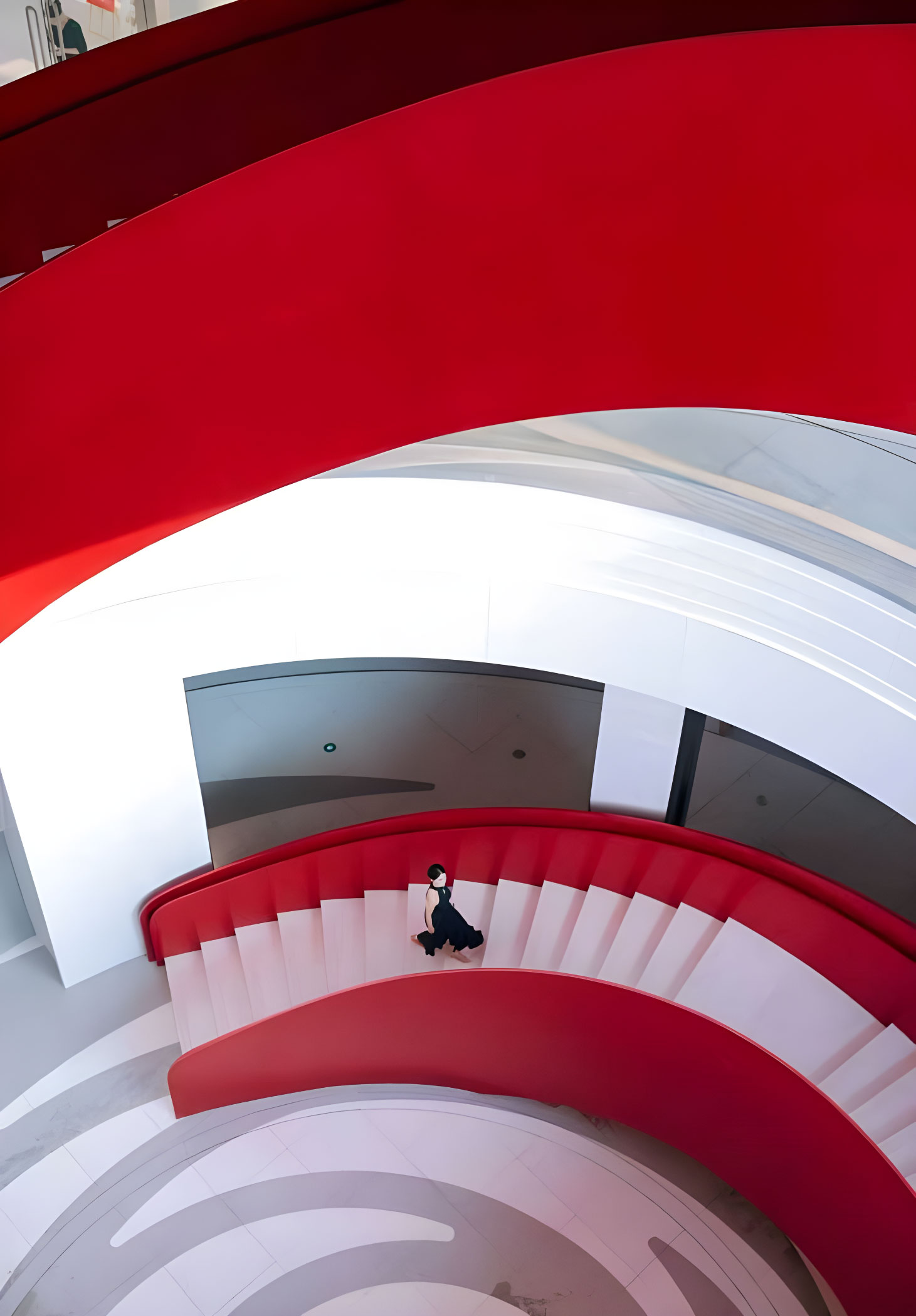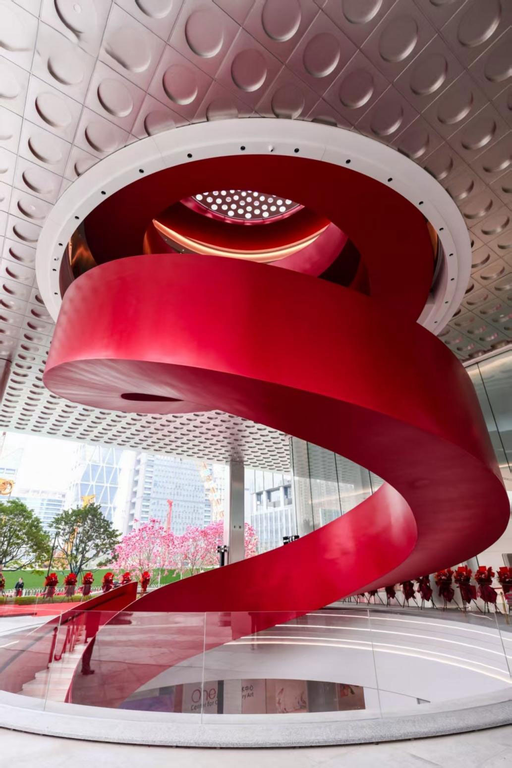 L’architecture extérieure du Centre d’Art OneM, avec ses volumes empilés semblant pivoter sur eux-mêmes, évoque la silhouette d’un danseur. L’escalier intérieur, en revanche, introduit un contraste marqué, comme s’il constituait l’axe autour duquel s’articule cette danse. Si le bâtiment se vrille pour regarder la ville, l’escalier serpente pour offrir à ceux qui le gravissent des vues changeantes, à travers les verrières, sur le paysage urbain et la rivière des Perles.