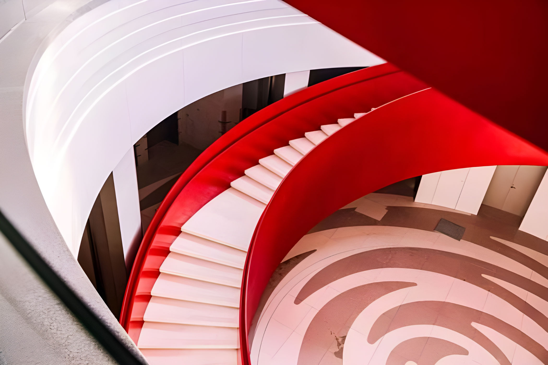 Atteindre une telle fluidité sans appui intermédiaire a exigé un travail d’ingénierie minutieux. Outre ses près de 1 000 tonnes de poids propre, l’escalier doit supporter celui des visiteurs. La structure est ancrée uniquement aux dalles des niveaux qu’elle relie, créant l’illusion optique d’un ruban suspendu, flottant dans l’air ou porté par le vent. Son rouge intense contraste avec la sobriété de la façade, les intérieurs industriels et les murs de verre.