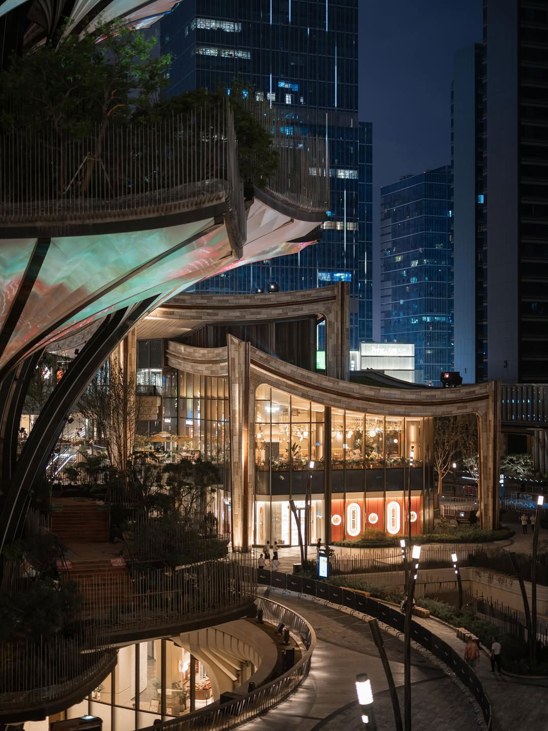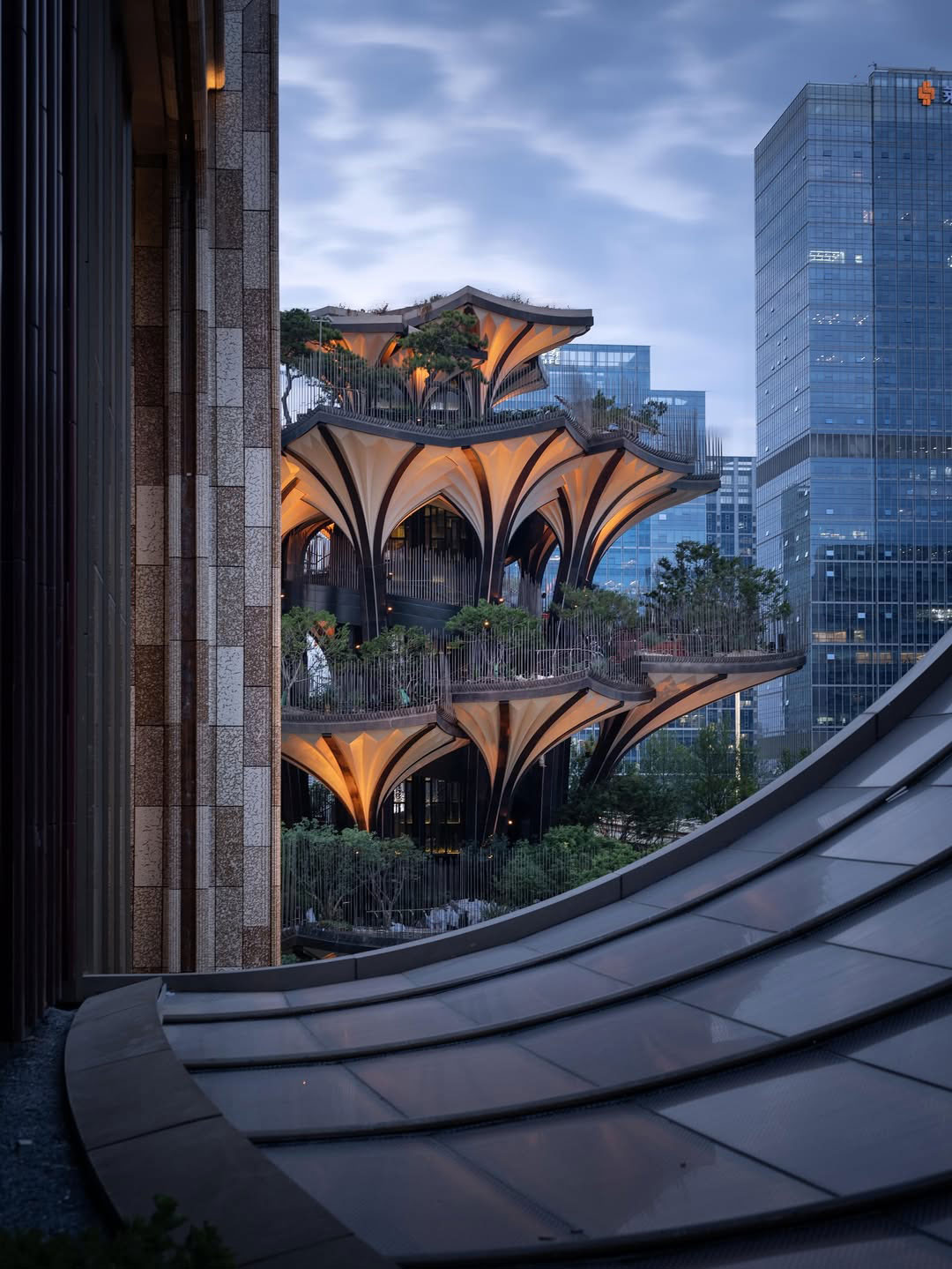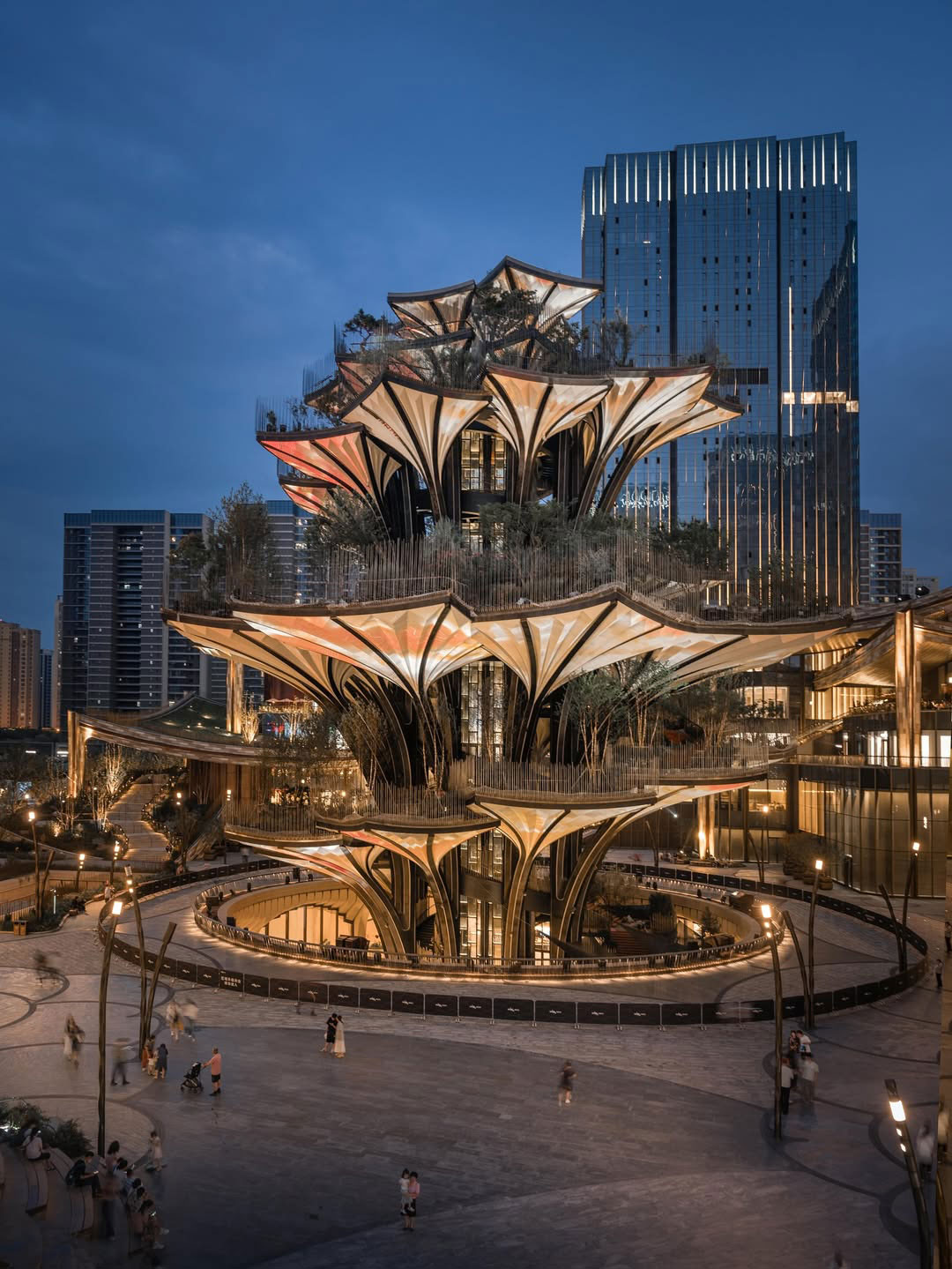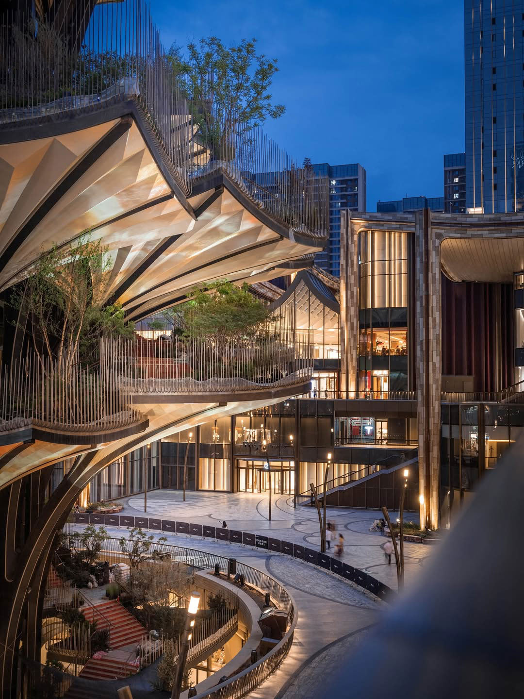 Xi’an Tree est un artefact architectural qui semble offrir, en geste de bienvenue, un salut à ceux qui explorent le CCBD ; comme si le quartier commercial et culturel leur tendait, rien que pour passer, un bouquet monumental de plantes vivaces. Formellement, de manière subtile et contemporaine, il évoque l’architecture traditionnelle chinoise. La structure de terrasses étagées rappelle les pagodes et les toits des temples, avec leurs avant-toits incurvés qui se déploient vers le ciel dans une sensation d’ascension. Cependant, Xi’an Tree est également un refuge de nature.